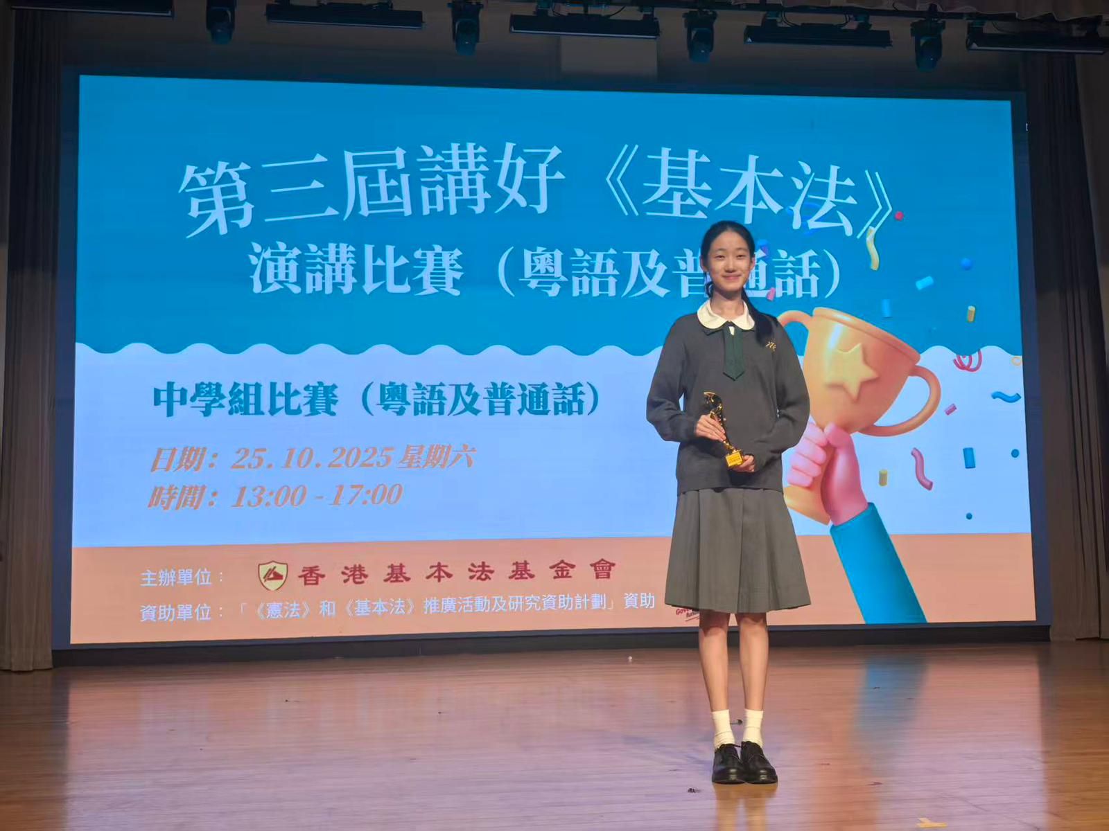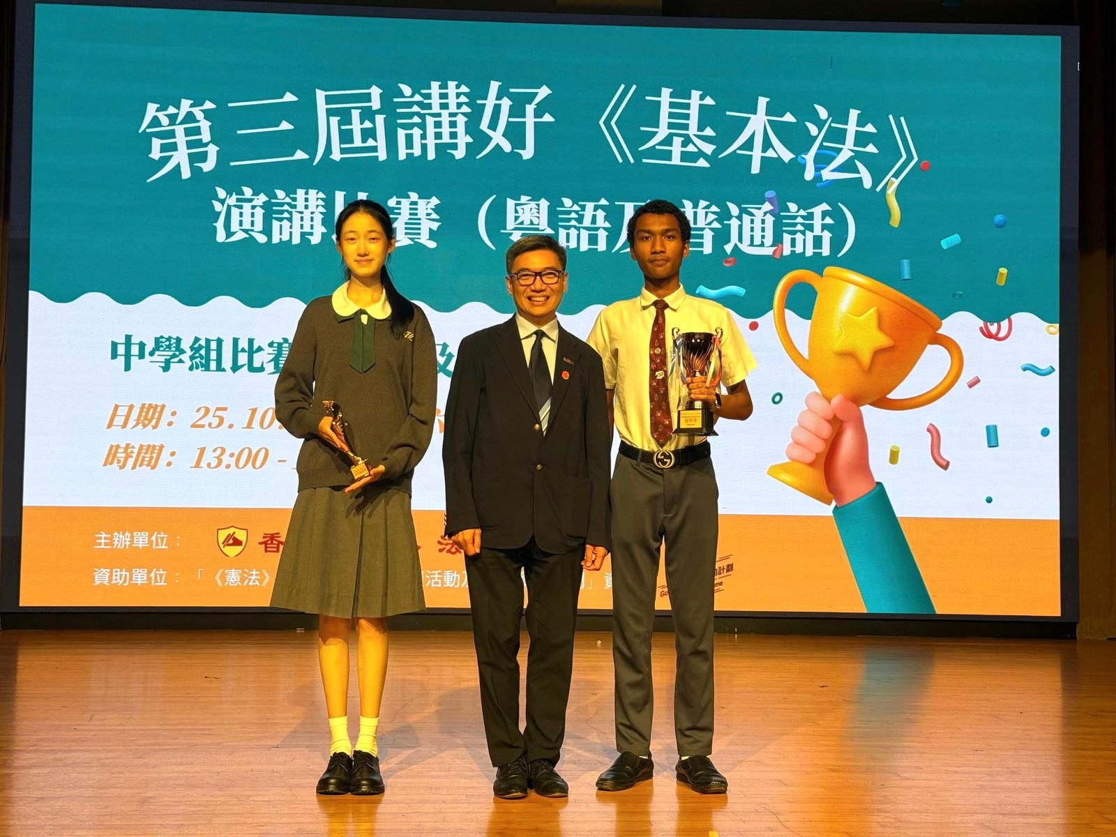 本校學生於2025年10月25日(星期六)參加由香港基本法基金會主辦、「《憲法》和《基本法》推廣活動及研究資助計劃」資助的「第三屆講好《基本法》演講比賽(粵語及普通話)」,在眾多參賽者中脫穎而出,表現出色,分別榮獲「優異獎」及「最佳構思奬」,為校爭光!