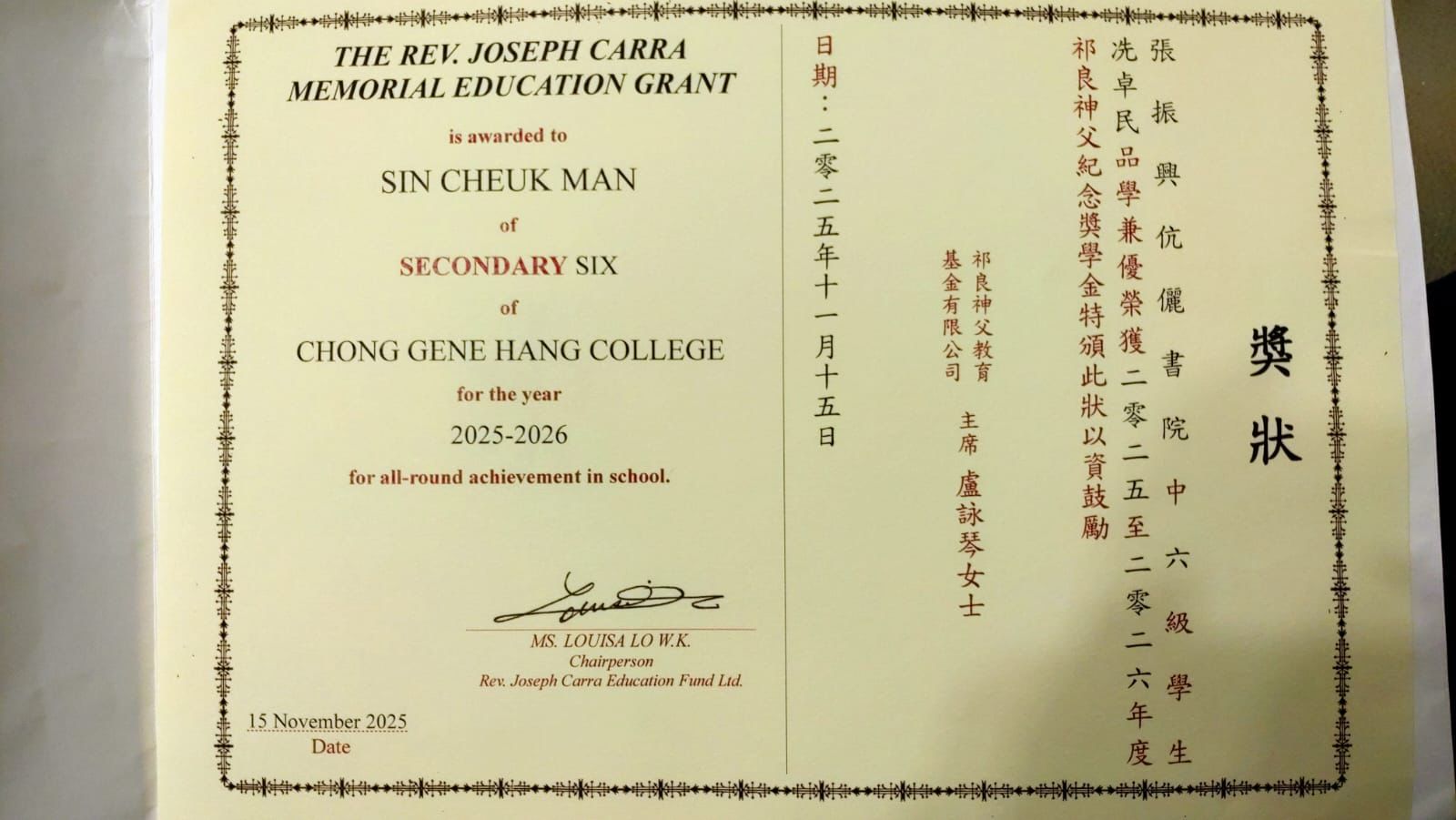 獲奬消息:冼卓民同學榮獲祁良神父紀念奬學金