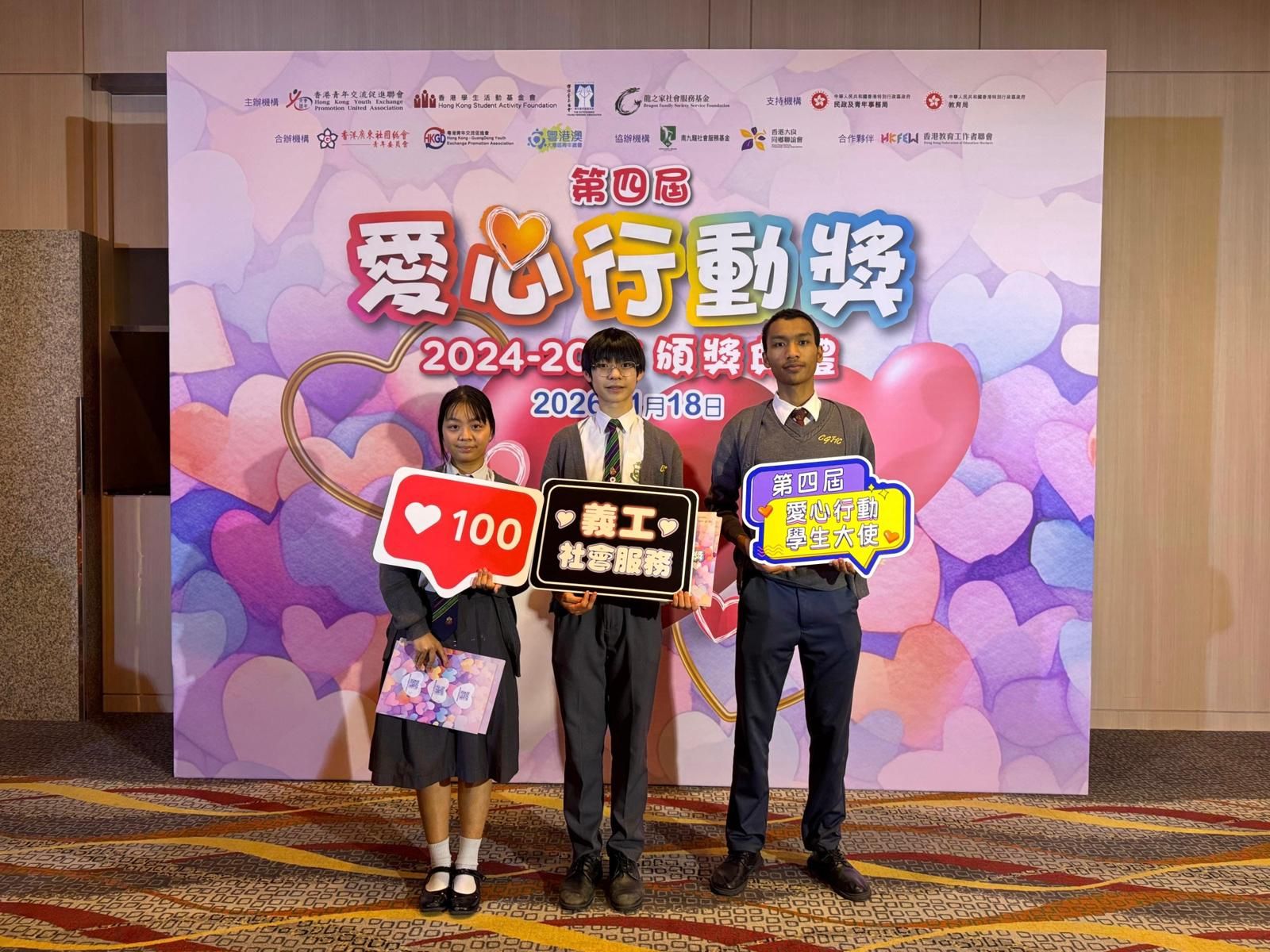 今年,本校四位熱心服務的學生獲大會頒發「愛心行動獎」!